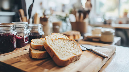 A cozy kitchen scene featuring freshly sliced bread on a wooden cutting board, surrounded by jars and various kitchen utensils, creating a warm atmosphere.