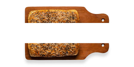 Two halves of wholemeal bread on a cutting board, on white background with copy space.