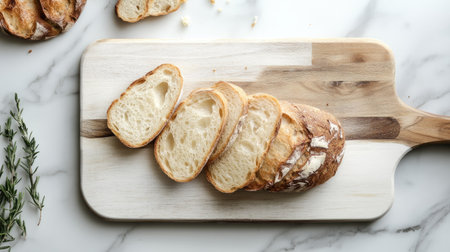 A beautiful rustic scene featuring freshly sliced bread artfully arranged on a wooden board, complemented by greenery, perfect for culinary presentations.