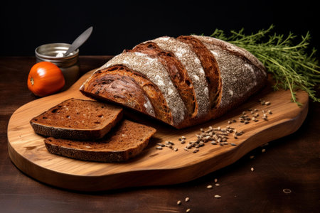 Yeast bread, whole grain rye bread. The starter is on the table. Homemade bread with natural sourdough is an organic bio-product. Handmade product, slices of bread on serving.Bread sliced on a cutting board.created with the help of artificial intelligence.