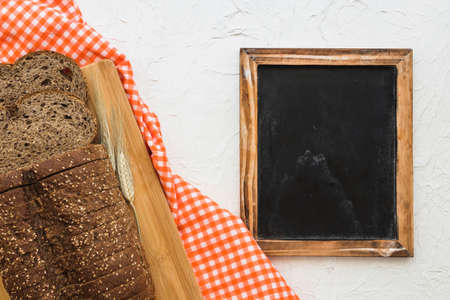 Various types of bread with ears of corn in the middle is a blackboard with copy space photographed on a wooden table in flat lay.