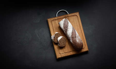 sliced rye flour baguette lies on a brown wooden board, top view