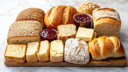 A beautifully arranged selection of assorted breads accompanied by butter and jam, perfect for breakfast or brunch. Ideal for food photography and culinary presentations.