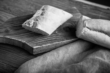 simple food ingredients concept, piece of baguette bread on cutting board with knife slicing it