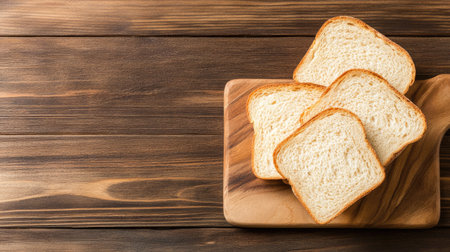 Four slices of freshly baked white bread displayed on a wooden cutting board, perfect for meal preparation or showcasing delicious breakfast options.