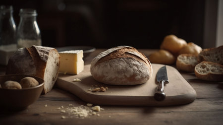 An AI generated illustration of homemade delicious bread on a wooden table