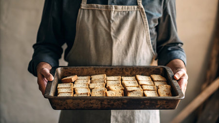 A mouthwatering selection of freshly baked bread cubes, perfectly seasoned and prepared for stuffing at a Thanksgiving feast.
