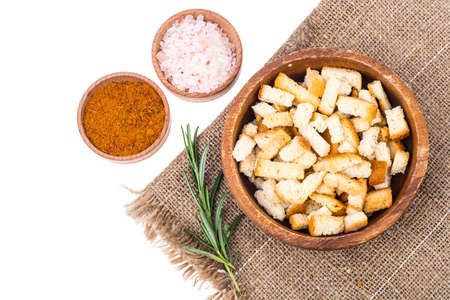 delicious crispy fried croutons in wooden bowl isolated on white