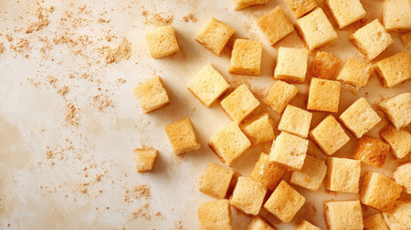 Homemade rye bread croutons texture background top view. Crispy bread cubes pattern, dry rye crumbs wallpaper, rusks mockup, crouoton or brown roasted crackers cubes flat lay