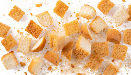 scattered crumbs of roasted white bread on a white background