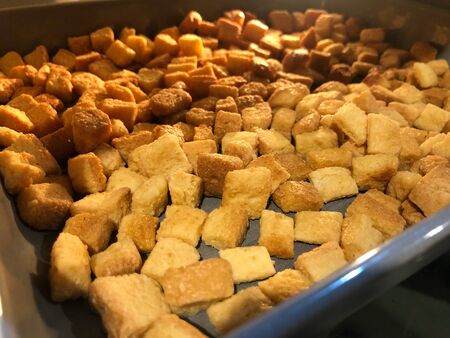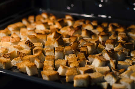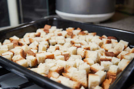 Small croutons on a baking tray top view