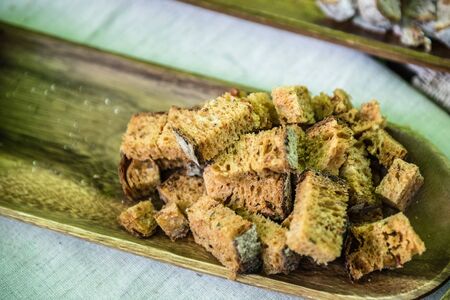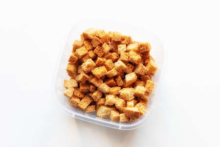 Rusks cubes on a glass plate. Dried fried bread slices with brown color slide in dishes.