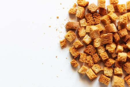 Top view at fresh crispy croutons of white bread. Close up view.