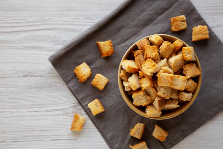 Homemade Crunchy Bread Croutons in a Bowl, side view.