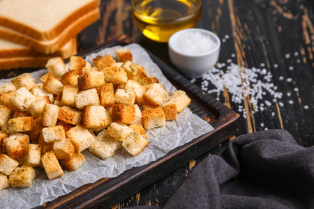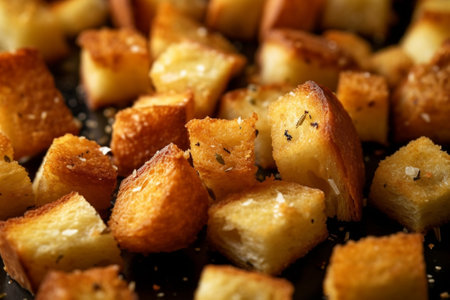 Golden brown garlic croutons scattered on a dark surface, garnished with herbs and spices