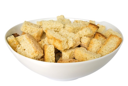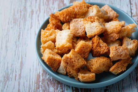Fried rye bread croutons on a white plate. Close-up photo.