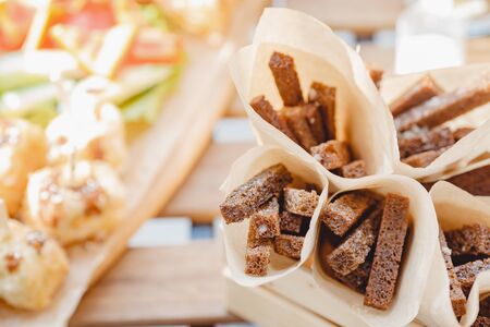 Homemade crunchy croutons with garlic, salt, herbs and spices. Spicy rusk sticks, seasoning rusks, small fried bread snacks, salted breadsticks, beer appetizer