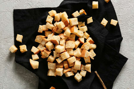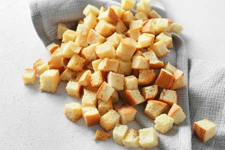 rye bread croutons on fabric, food close up