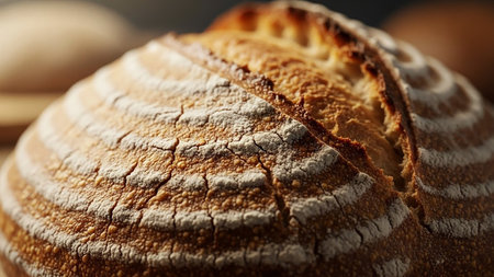 Freshly baked sourdough loaf displays a mesmerizing crust with intricate patterns. The golden-brown surface invites you to experience the warmth and aroma of artisan baking.
