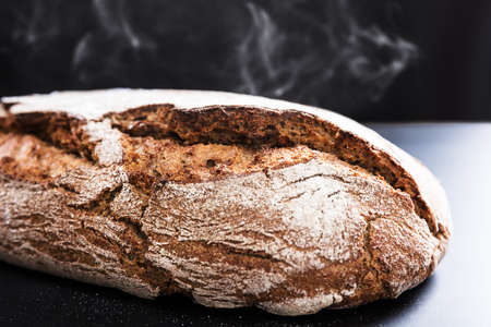 Freshly baked loaf of bread on wooden board with smoke on dark background