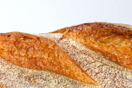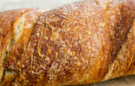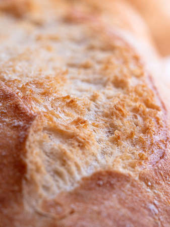 Fresh crusty bread as background. Close-up.