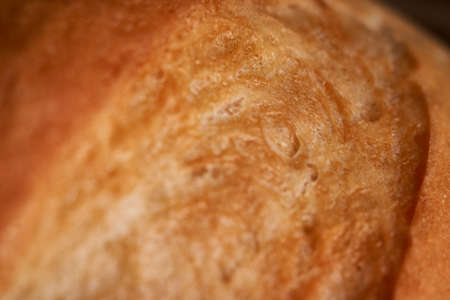 Macro photo of delicious crunchy baked crust of freshly baked baguette. Tasty natural healthy food.
