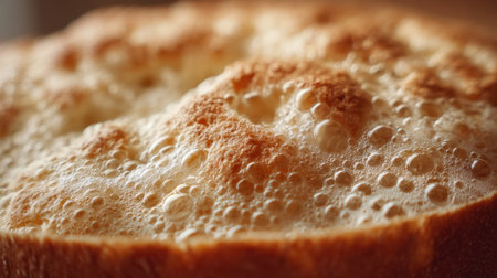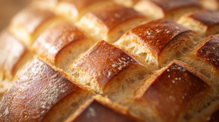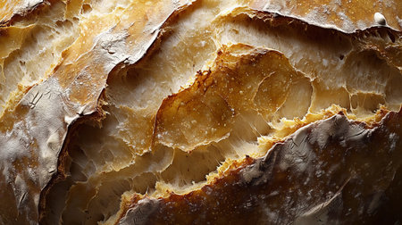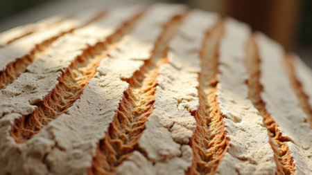 Close-up of crusty artisan bread with golden crispy texture highlighted by sunlight. That the image is generated using AI.