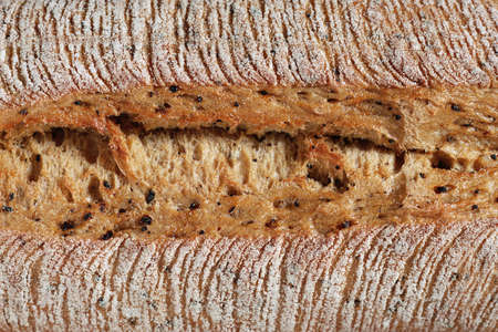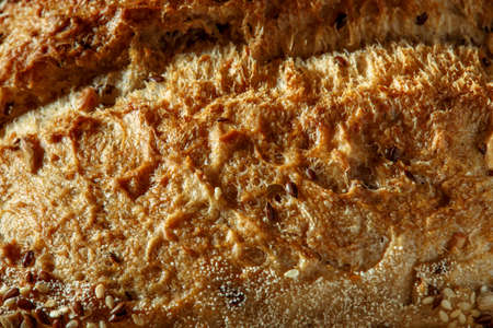Hearth whole grain bread baguette with the addition of buckwheat flour close-up macro photography