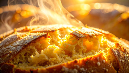 Golden morning light illuminates a rustic loaf of artisan bread, fresh from the oven.