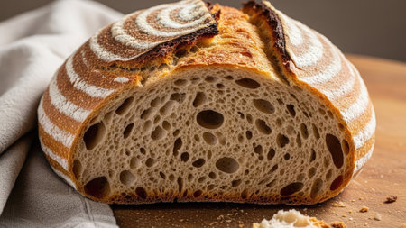 A rustic sourdough bread with a crisp crust and a tangy flavor created with Generative AI