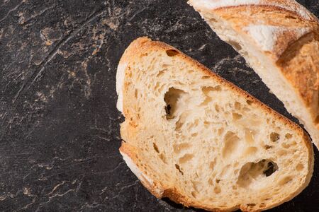 top view of cut fresh baked white bread on stone black surface