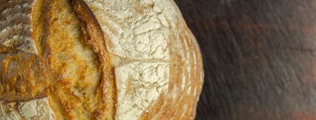 Baked bread of sourdough. Bread crust. Close up. The bread of sourdough, homemade and natural creation. The sourdough has natural yeast, which makes the food healthier, as well as rich.