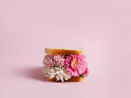 Delicious homemade sandwich with flowers on pastel pink background. Creative floral bloom concept. Minimal spring or summer food theme. Abstract visual trend.