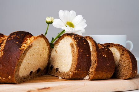 Multi grain board close up - Image. Black bread sliced ​​​​on the background of the decor of flowers - Image