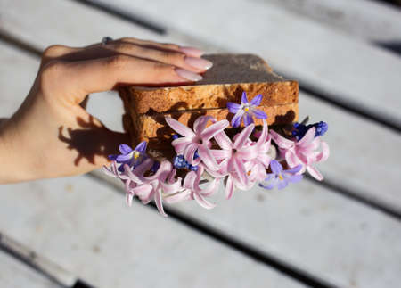 Woman's hand holds fried toast bread with hyacinth flowers. Delicious breakfast, good morning, flower fantasy.