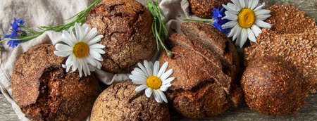 Freshly baked traditional bread on rustic wooden table. Panorama banner
