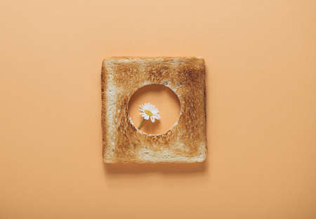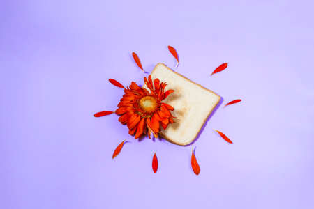 a gerbera flower on a toasted slice of bread, which lies on a lilac background and petals arranged in a circle.