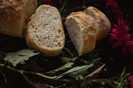 Golden wheat baguettes. Two craft loaves of crispy bread on brown wooden table with wildflowers on it. Top view. Horizontal format.