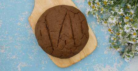 loaf of fresh baked artisan rye and whole grain bread on wooden blue rustic table with summer flower camomile and cutting board at sun day. Outdoors. Horizontal flatlay. Copy space. Banner
