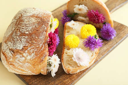 Fresh bread with flowers on color background, closeup