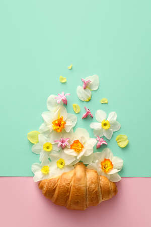 Croissant with many different colorful flowers on a pastel pink background. Minimal spring or summer concept. A modern fun concept of stylish food, gifts, anniversary and love. Copy space