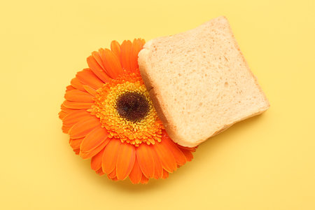 Composition with slices of bread and beautiful chrysanthemum flowers on yellow background