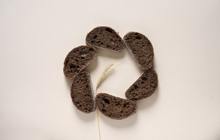 Cutting slices of bread with crumbs and spikelets in the circle foarm on nude background. world hunger concept