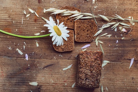 Natural background- rustic mood. Still life: sheaf of oats, sliced brown bread, daisy