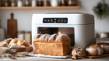 A sleek stainless steel bread machine sits on a countertop next to freshly baked bread, enhancing a bright kitchen with a touch of modern design and convenience.