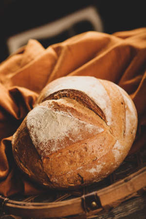Freshly baked bread on wooden table. Selective focus with shallow depth of field.