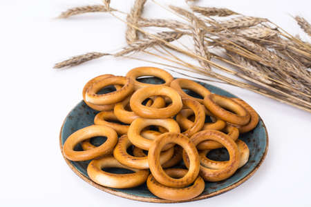 Traditional Russian folk dishes for tea, round or oval drying, isolated on white background. Dried baked bagels. Dessert.