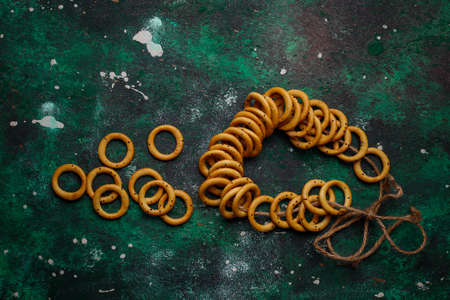 Traditional russian bagels on a rope on dark wooden table background, top view.