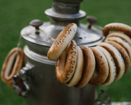Russian vintage samovar for boiling water for tea. On the samovar hang a bundle of bagels.