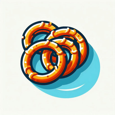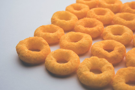 Onion rings and crackers floating on a beige background, ideal for food related advertising